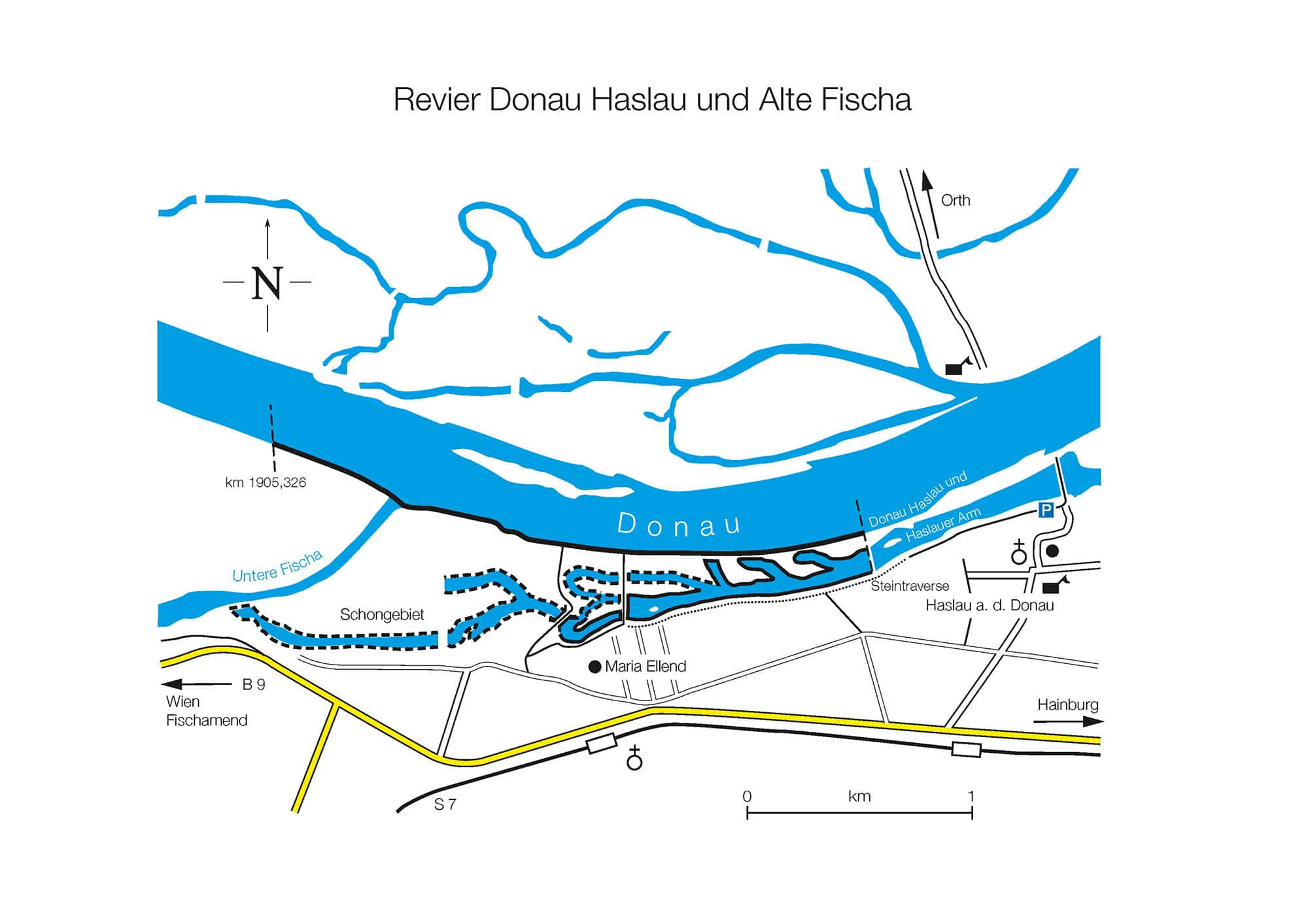 Donaustrom rechtes Ufer von Gemeindegrenze Orth-Mannsdorf Strom-Km 1905,326) stromabwärts bis zur Steintraverse. Alte Fischa von der Steintraverse flussaufwärts bis zur Maria Ellender Traverse sowie der landseitige Arm oberhalb der Maria Ellender Traverse bis zur ersten Brücke. Es besteht zudem ein Nationalparkschongebiet –> siehe Revierplan