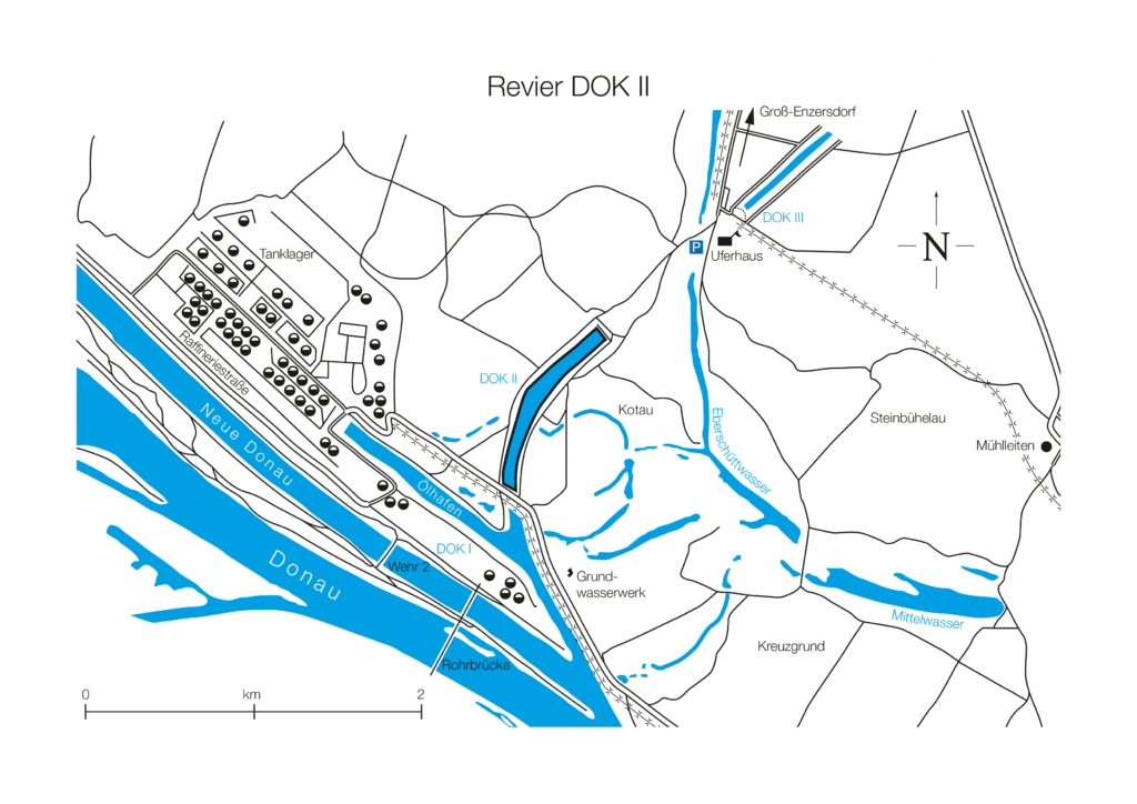 Im oberen Bereich des Nationalparks gelegen, ist der DOK II ein Fischwasser, das keine Wünsche offen lässt. Das rund 1,6 Kilometer lange, 80 bis 150 Meter breite und zwei bis drei Meter tiefe Gewässer liegt inmitten von uraltem Auwald und ist vollkommen unverbaut. Es ist von allen Seiten zugänglich und ein Paradies für den ambitionierten Fried- und Raubfischfischer.