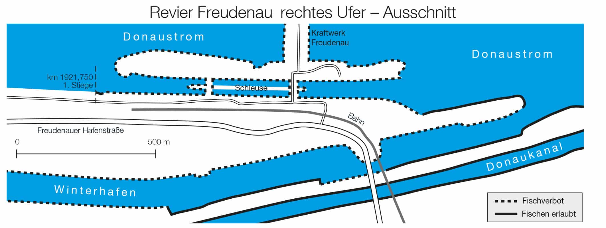 Donaustrom nur rechtes Ufer von Strom-Km 1921,750 bis zur Mündung des Donaukanals. Donaukanal von der Ostbahnbrücke (Simmering) bis zur Mündung. Ausgenommen ist das eingezäunte Gebiet des E-Werks Simmering. Freudenauer Winterhafen.