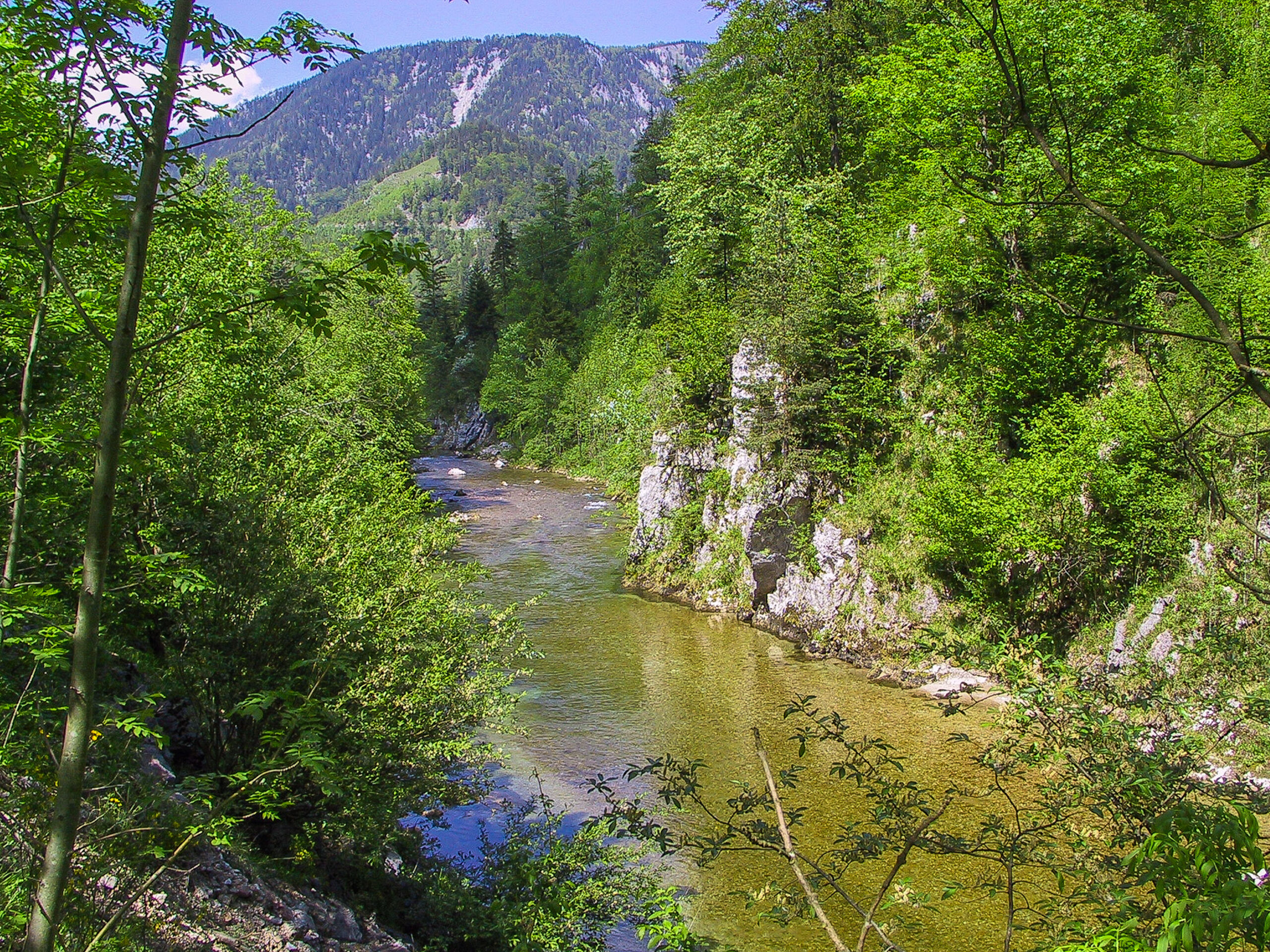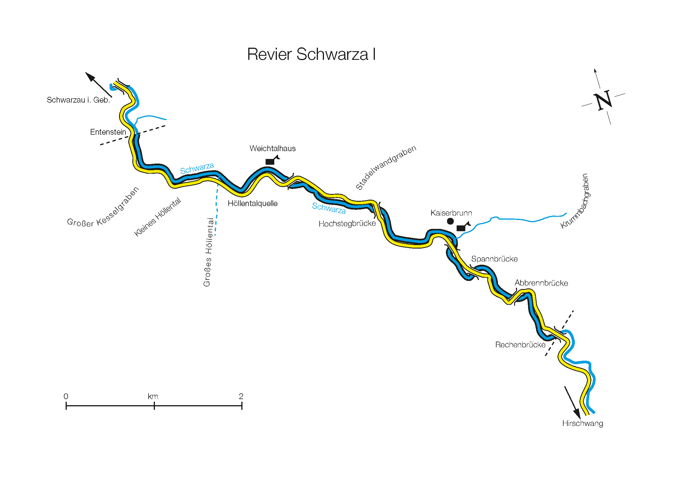 Schwarza vom Entenstein (ca. 200 m oberhalb der Bushaltestelle „Großer Kesselgraben“) abwärts bis zur Rechenbrücke oberhalb der Raxbahn-Talstation bei Km 24 der Höllental-Bundesstraße..